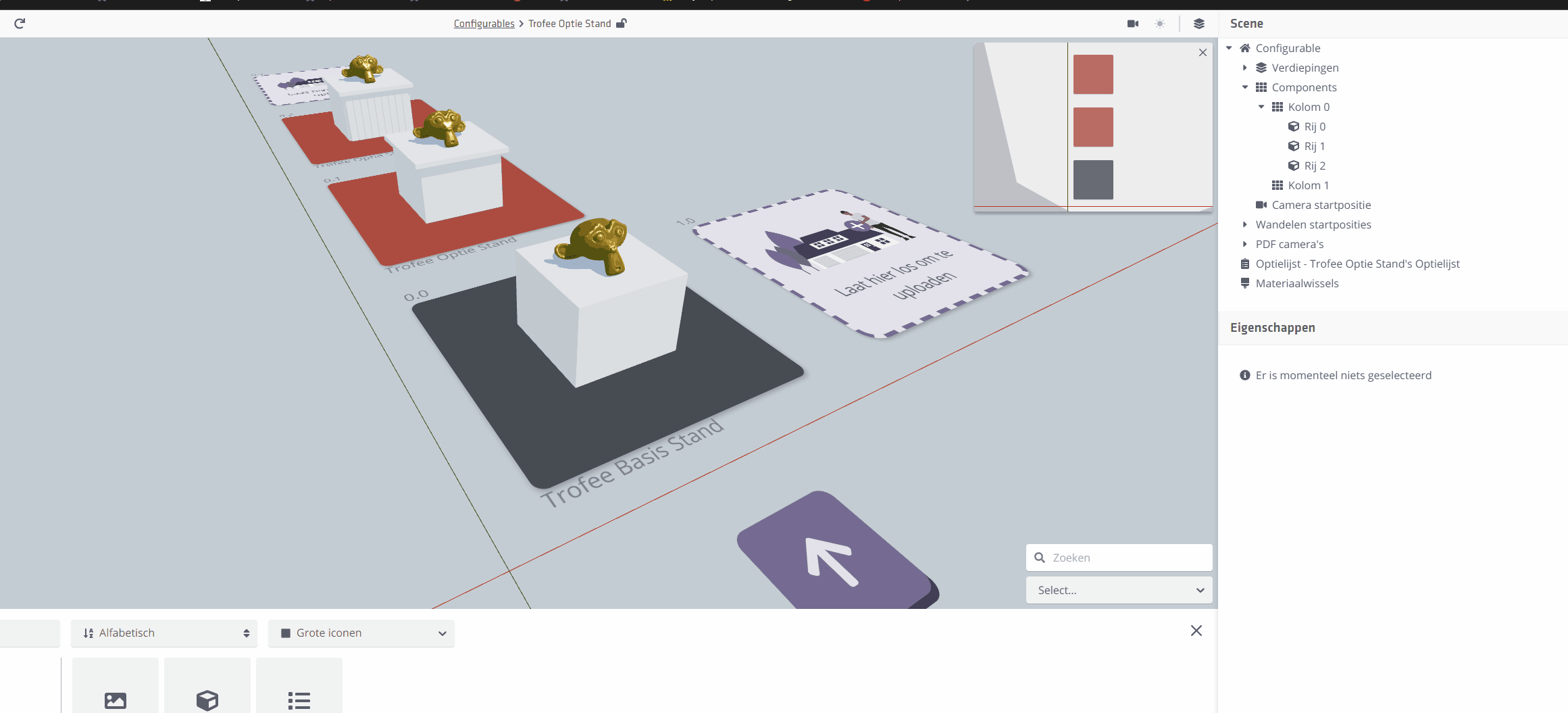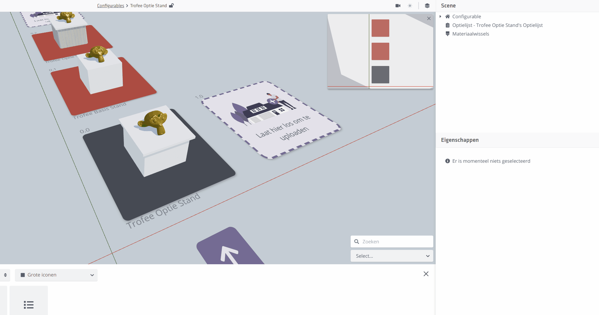 Nadat een nieuwe Configurable is aangemaakt kun je op de thumbnail klikken om de Configurable-Editor in te gaan. In deze editor kun je de opties aanmaken, en deze gaan koppelen aan de GLB's die geupload zijn. In het Weergave menu kun je een model in 'ingeklapte' en 'uitgeklapte' vorm tonen. De ingeklapte vorm toont, in beginsel, de configuratie met de BASIS groepen actief.